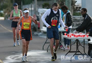 Runners grab water at the last water stop on North Shore, before the final stretch to Finish Line.